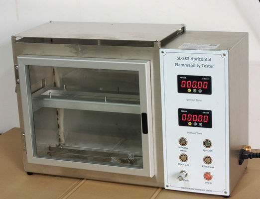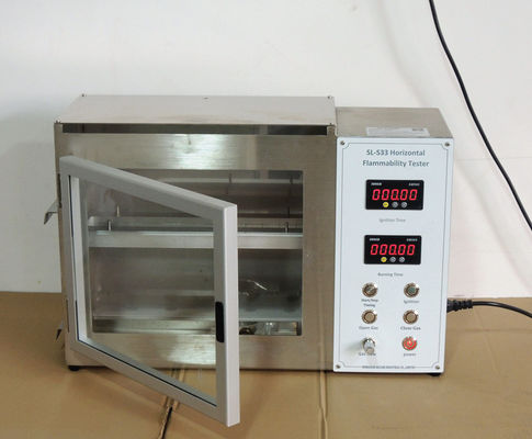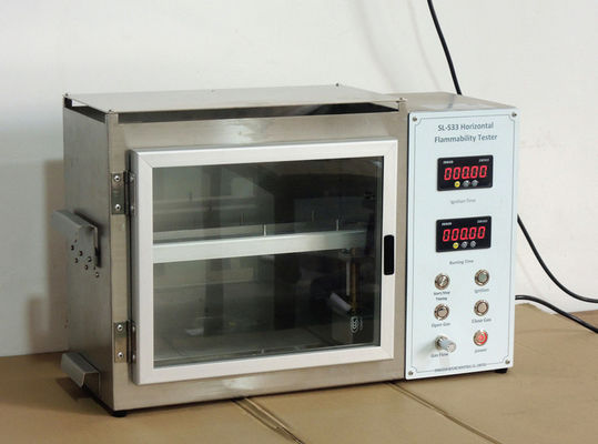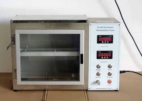 Das Instrument besteht aus zwei Teilen: der Schaltkasten und der Verbrennungskasten. Die Probe wird flach durch die Klammer festgeklemmt und setzte an der Klammer des Verbrennungskastens. Die Flamme wird durch den Schaltkasten während einer bestimmten Zeit angezündet, und die Flamme wird ausgelöscht. Beobachten Sie die Flammenverbreitung der Probe, Maß die Zeit, die sie nimmt, damit die Flamme einen bestimmten Abstand auf der Probe verbreitet, berechnen Sie die Verbreitungsgeschwindigkeit der Flamme, und werten Sie den Flammenwiderstand der Probe aus.