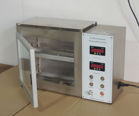 Das Instrument besteht aus zwei Teilen: der Schaltkasten und der Verbrennungskasten. Die Probe wird flach durch die Klammer festgeklemmt und setzte an der Klammer des Verbrennungskastens. Die Flamme wird durch den Schaltkasten während einer bestimmten Zeit angezündet, und die Flamme wird ausgelöscht. Beobachten Sie die Flammenverbreitung der Probe, Maß die Zeit, die sie nimmt, damit die Flamme einen bestimmten Abstand auf der Probe verbreitet, berechnen Sie die Verbreitungsgeschwindigkeit der Flamme, und werten Sie den Flammenwiderstand der Probe aus.