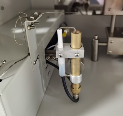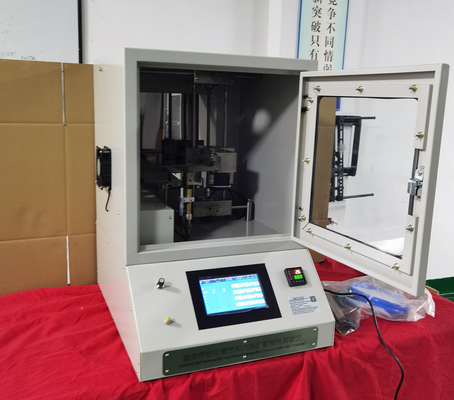 Während einer Berichtsperiode der Zeit, wird das Ende der horizontal orientierten Förderbandprobe der Flamme vom gekennzeichneten Gasbrenner unterworfen, und die Dauer des Entfernens der Brennerflamme wird gemessen. Nachdem die Flamme verschwindet, Durchläufe eines Gasflusses durch die Probe, zum der Nachglutdauer zu messen.