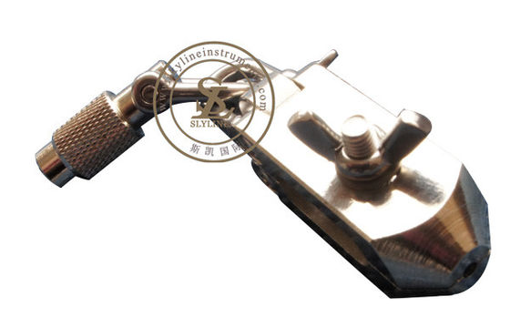 Zu die Holding oder die Bruchfestigkeit des Zinkeringes zu bestimmen befestigte Druckknöpfe auf Kleider. Besteht aus einer oberen Schnellklammer, einer unteren Gewebe-Klammer u. brachte Drucklehre an einem Stand an. Die Schnellkomponente wird durch die obere Schnellklammer gegriffen und das Kleid wird an der unteren Gewebe-Klammer befestigt. Verwendet für das Messen der Verantwortung des Kleiderherstellers sicherzustellen