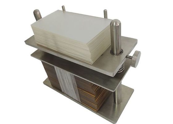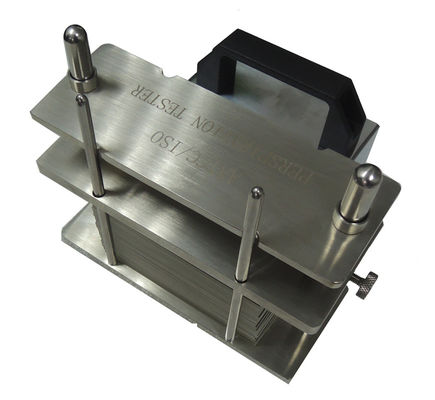 besteht aus einigen Acrylplatten und das im passenden ladenden Rahmen gehalten werden kann. Der ladende Rahmen besteht aus zwei Stahlplatten, zwischen denen die Acrylplatten setzten. Das Probestück werden zwischen passenden weißen Stoffstücken genäht und eintauchten entweder in die alkalischen oder säurehaltigen Testlösungen.